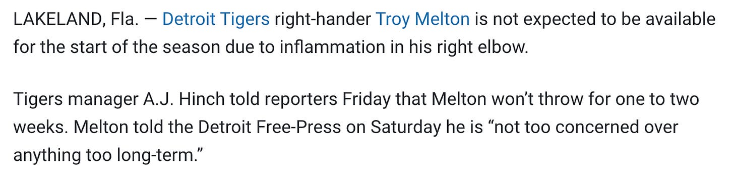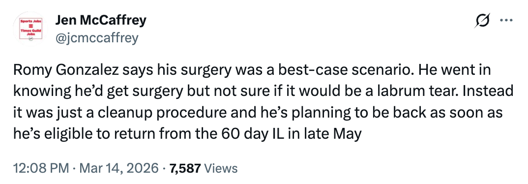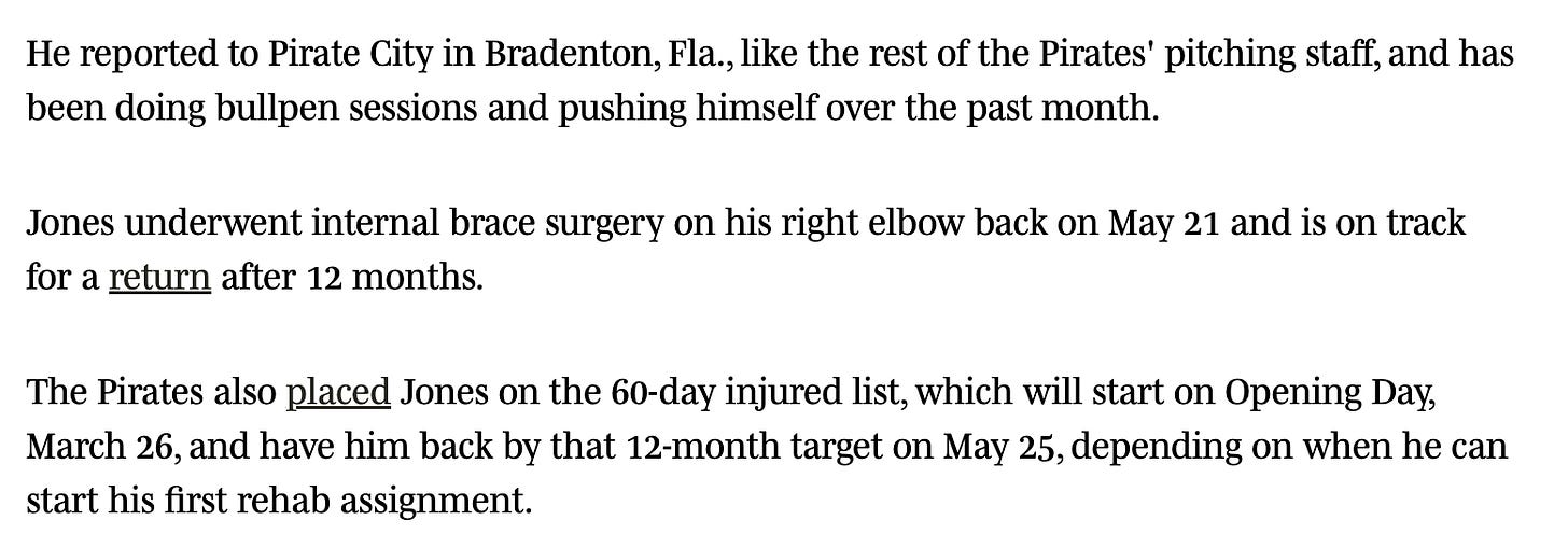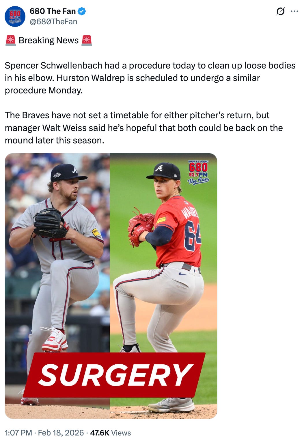 Both of these pitchers got more or less the same sort of procedure done to remove loose bodies from their elbows. Their timelines might be slightly different in that their operations happened about a week apart, and that Schwellenbach has more Major League experience than Waldrep. It would make sense that both should be in the Braves’ rotation later this season, given the lack of depth the team now faces. Their progress will be interesting to monitor, but both are worth stashing.