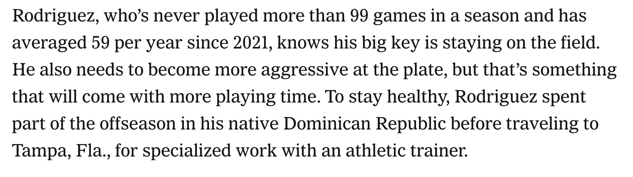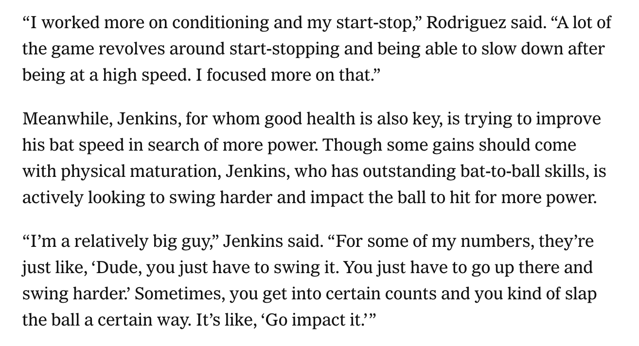 Both players are seen as the cornerstones of the Twins organization. They have immense upside and talent, and both should be rostered in all dynasty leagues. However, it’s no secret that they’ve been hurt a lot over the years, too. For Jenkins, four lower-body injuries over two years have resulted in extensive time missed. Rodriguez has had injuries all over his body, resulting in eight different instances in which he has missed time to develop his craft. Both need to stay healthy and show that they are ready to make their debut next season when the Twins are hopefully ready to compete.