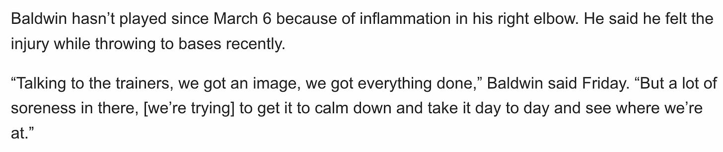 Baldwin will take it day by day to see if the inflammation in his elbow subsides. We should know more by the end of this week if rest is enough for him, or if the team needs an alternative method to help alleviate the pain. As it stands, the team isn’t overly worried, and neither am I; however, that can change if the concept of rest is not enough for him. A decision regarding Opening Day has not yet been made.