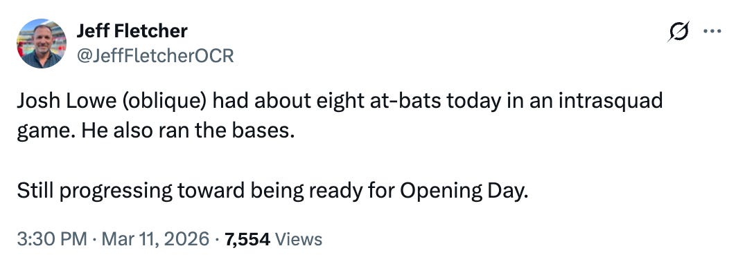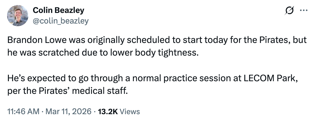 I wish I had more news from the Pirates regarding this injury, but unfortunately, this is all there is. This was the initial news about Lowe’s status the day it happened. All we can go on is experience with health, and Lowe has been someone who struggles to stay on the field and is a slow healer. For that reason, I will say that he likely won’t be ready for Opening Day, but we could get news any day now.