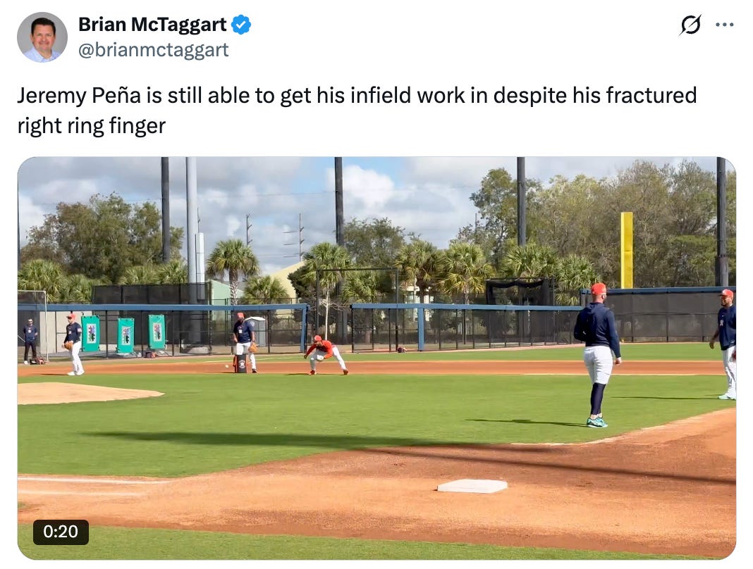 Pena will be re-evaluated this week. If that evaluation goes smoothly, then he should be ready for Opening Day. However, if there is a setback or it’s revealed that he cannot grip a bat, then chances are he will miss some time and possibly head to the Injured List. It’s the Astros. Any other team, I’d give him the benefit of the doubt, but here, you just never know.