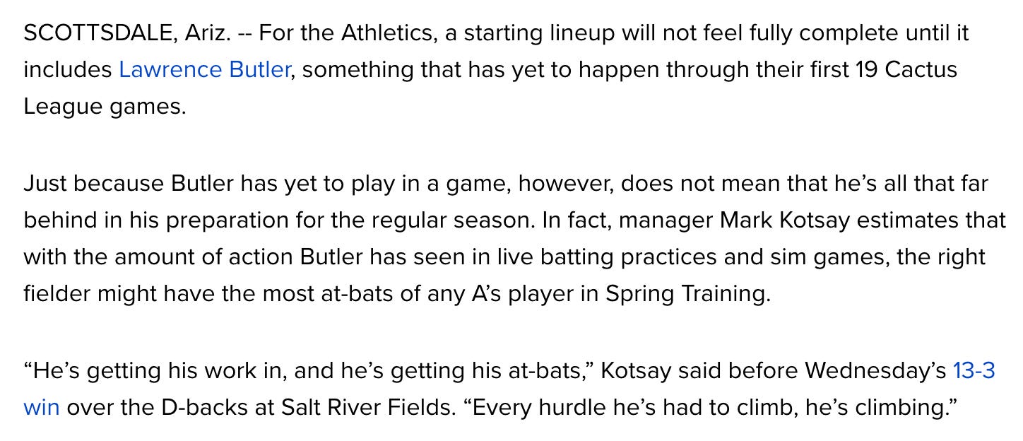 The team estimates that Butler has seen 30 live at-bats and is hopeful that he’s done enough to get himself ready for in-game action. This one is concerning, in that he had the operation last October, and he still required offseason injections to help ease the tendinitis. He’s yet to appear in the team’s actual Spring Training games, and that means more than these simulated at-bats.